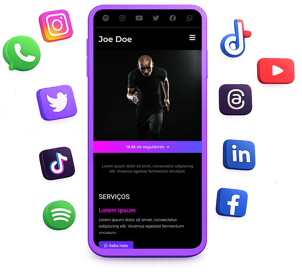 - Links de redes sociais (Instagram, TikTok, LinkedIn, etc.)
